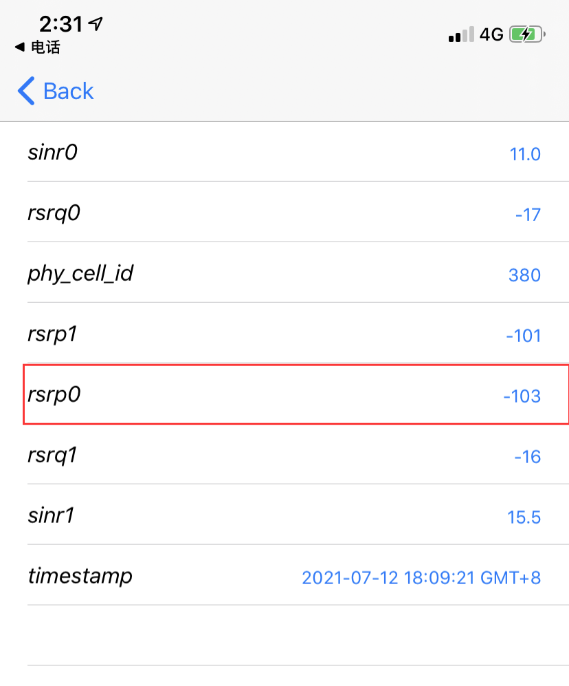 英爾特基帶以iPhone11為例:在撥號鍵盤輸入【*3001#12345#*】然后點呼叫—點擊LTE—點擊Serving Cell Meas—看到rsrp0 這個選項就是顯示當前信號數值。