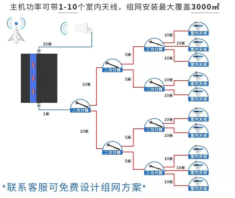 組網安裝最大可覆蓋3000平方,這里5層樓一共搭配10個室內天線,每層安裝2個室內天線就能深度覆蓋52個房間的信號問題。